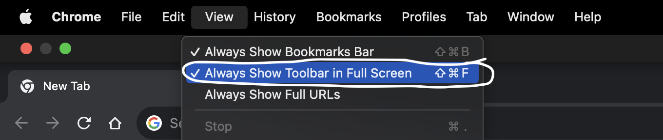 You might have noticed that if you are in full screen Chrome, then all your tabs will be covered. To solve this problem, you can simply go to View on the top of the screen (hover your pointer above it and it'll appear), and press Always Show Toolbar in Full Screen, so it is UNCHECKED.